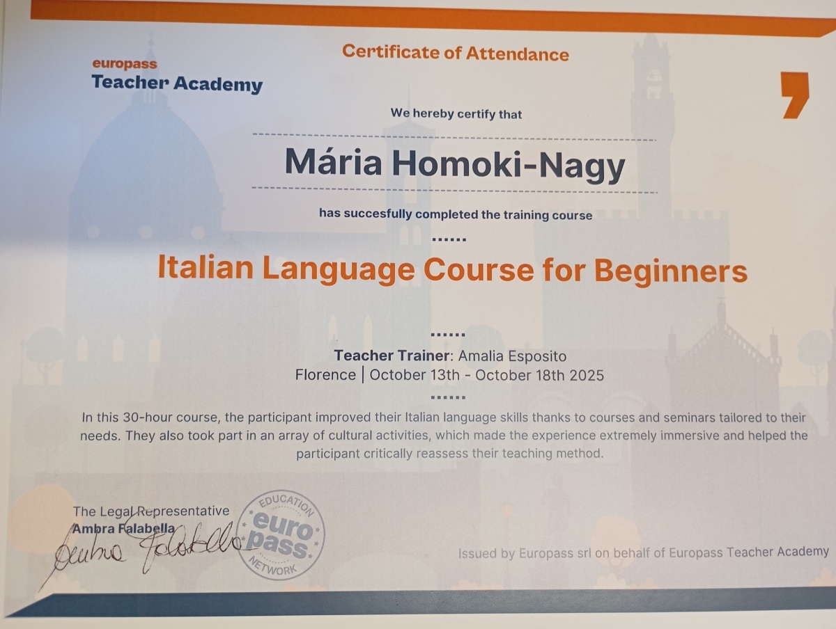 2025. október 13-18-ig vettem részt az Europass Teacher Academy által szervezet, az Italian Language Course-on keresztül megvalósított tanfolyamon Firenzében.